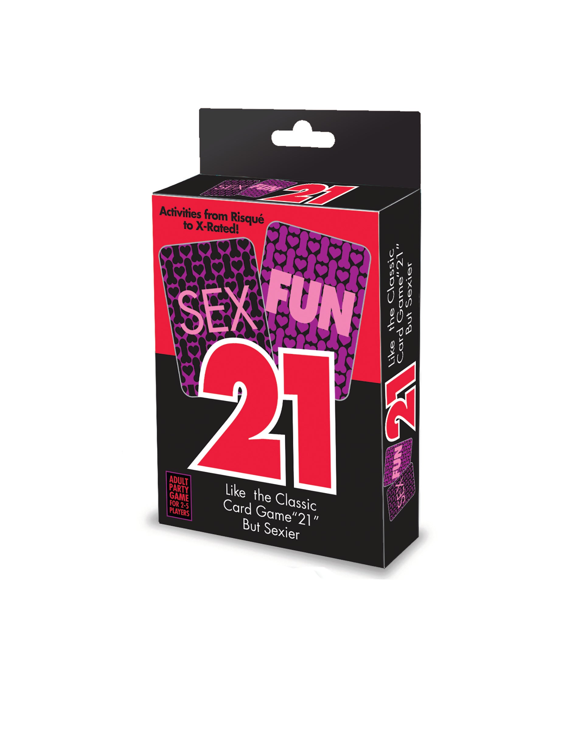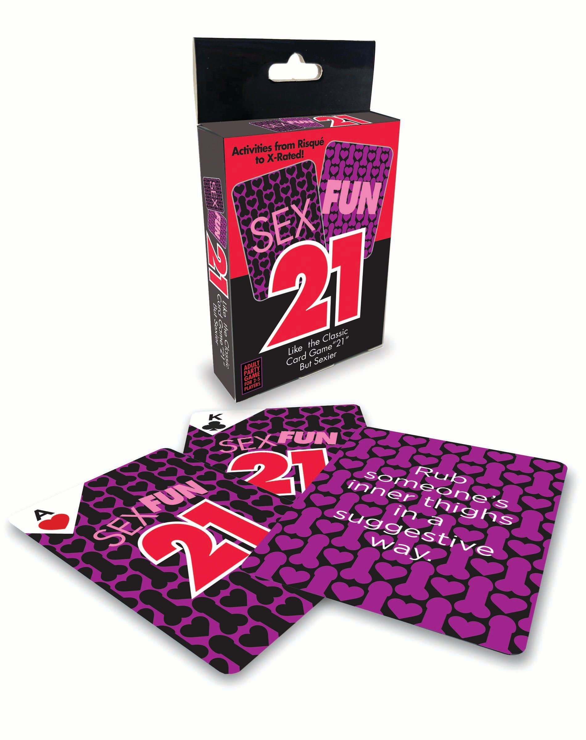 New Packaging- same great game! Sex Fun 21 is a blackjack-style adult card game. The gameplay is similar to blackjack with an additional four aces, so the chances of getting "blackjack" increase. Each card has a sexy activity to perform throughout gameplay. Sex Fun 21 can be played with two or more people.