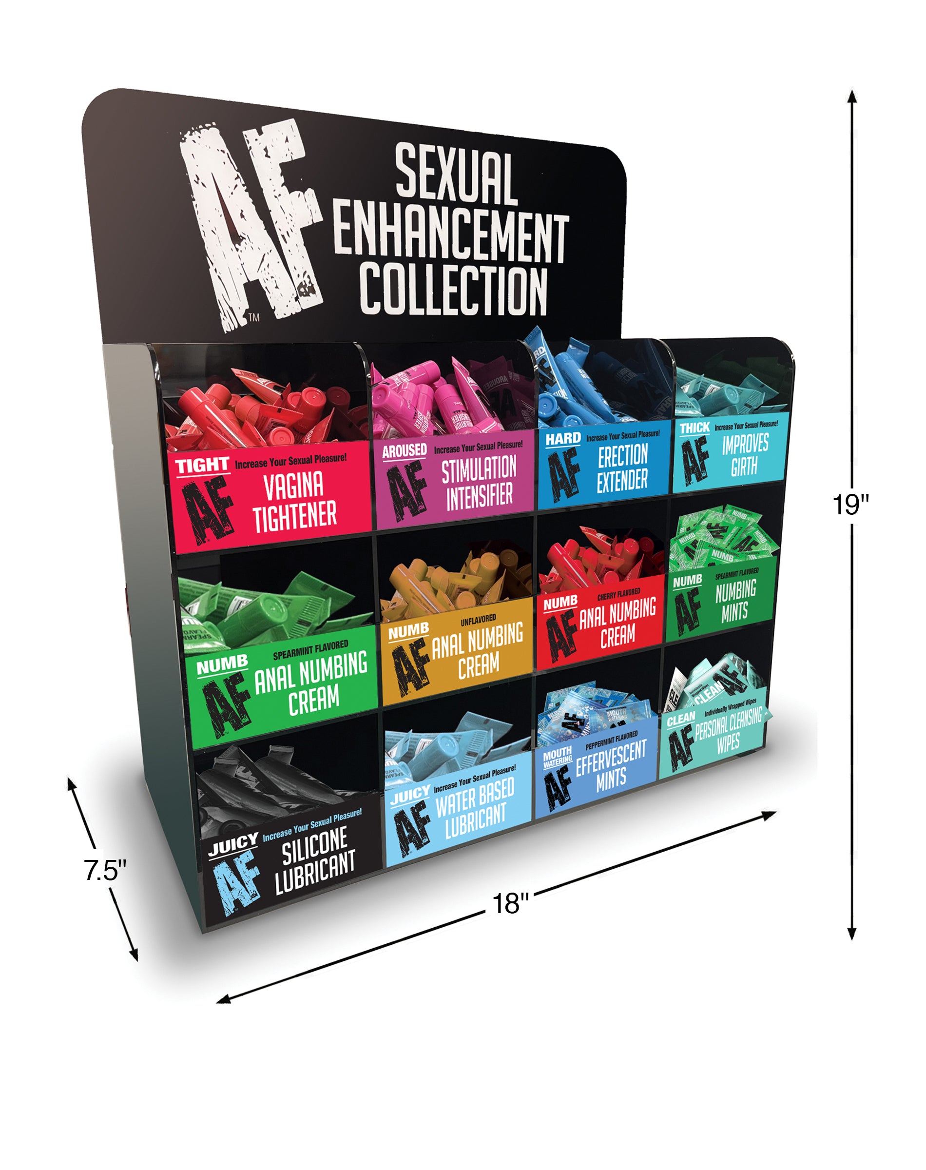 AF display features a stunning POP display of our top-selling AF enhancements and lubricants. The following are included in each display and can be purchased individually as you sell through each product.