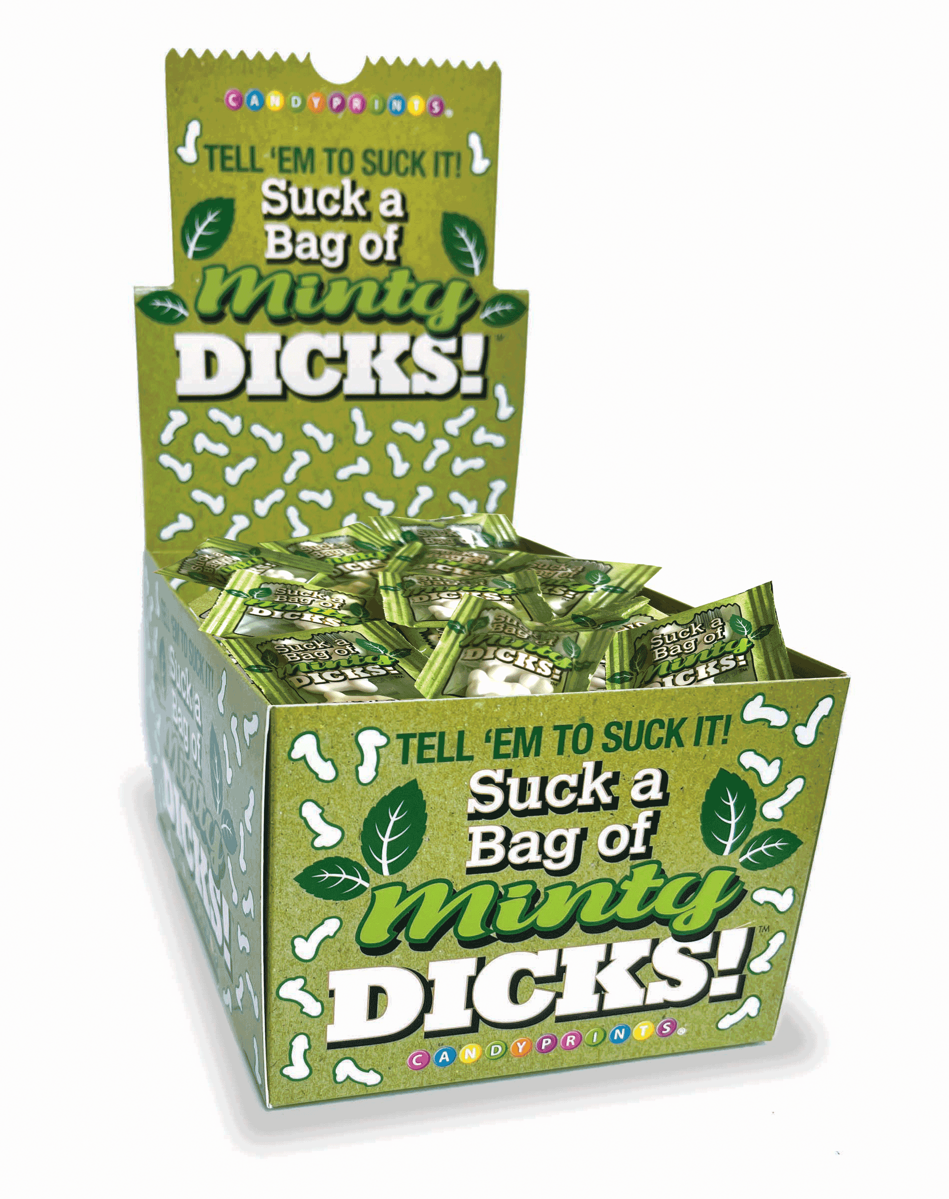 Breath mints with an attitude. Suck a Bag of Minty Dicks is refreshing and hilarious to freshen your breath. Each mini-pack contains five penis mints. Each display has 100 packs per display