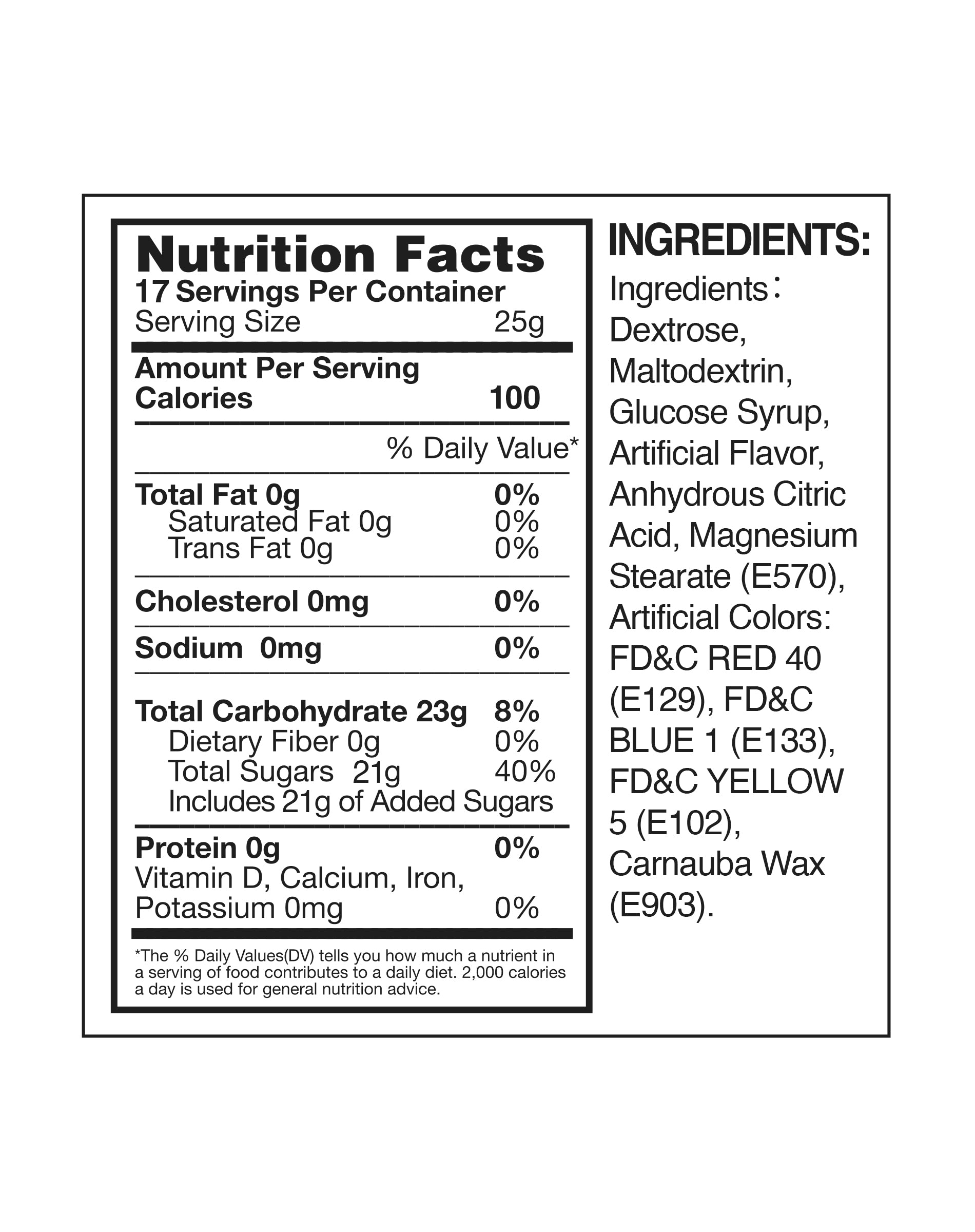Dextrose, Maltodextrin, Glucose Syrup, Artificial Flavor, Anhydrous Citric Acid, Magnesium Stearate (E570), Artificial Colors: FD&C RED 40 (E129), FD&C BLUE 1 (E133), FD&C YELLOW 5 (E102), Carnauba Wax (E903).