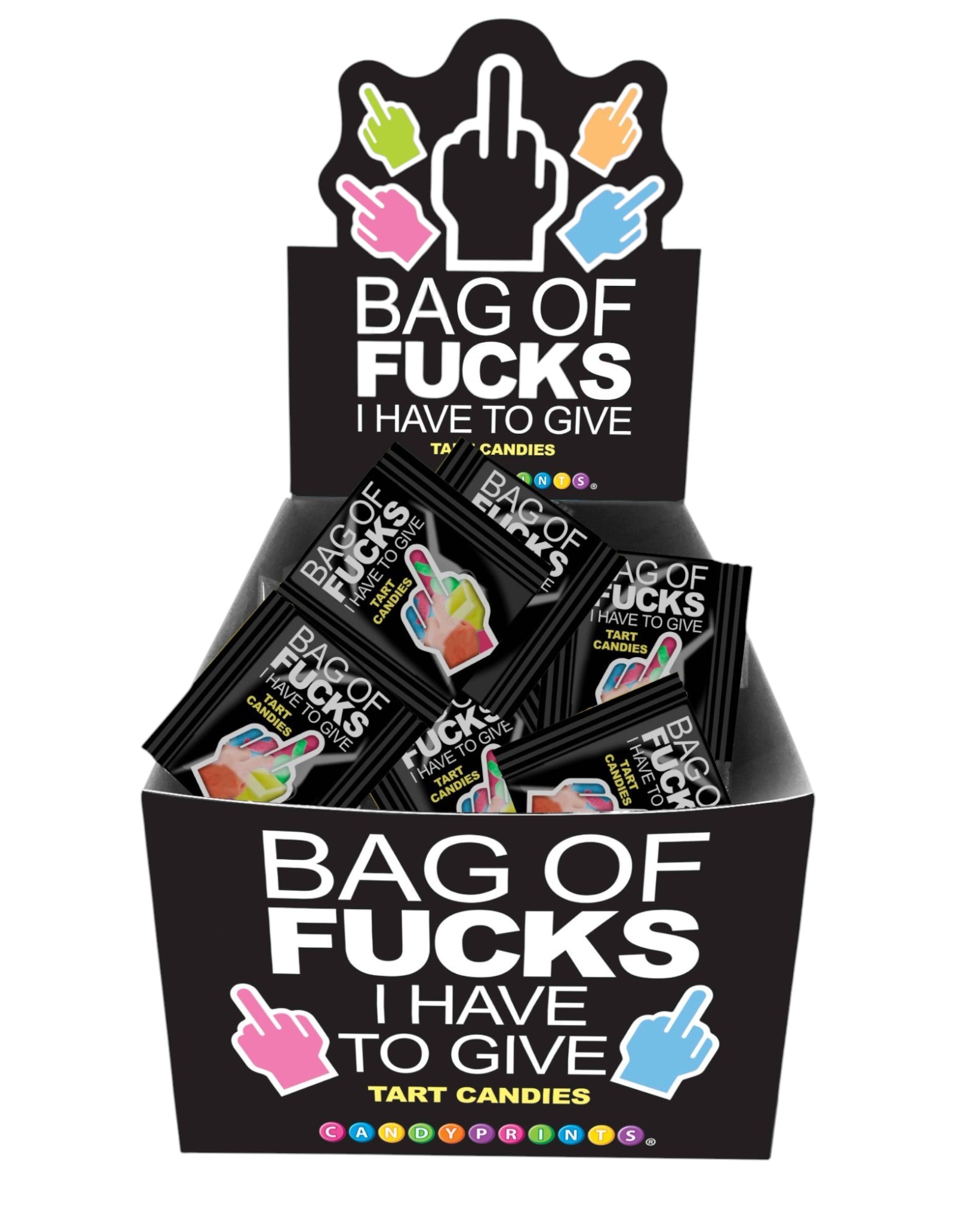 Introducing the Bag of Fucks I Have to Give candy because sometimes you just need a little humor to sweeten your day! Get this POP display with 100 mini-packs marked for individual sale; these fruit-flavored middle fingers are here to make a statement. Perfect for when you want to express how much you care—without saying a word. Whether treating yourself or gifting it to a friend who could use a laugh, this candy will surely be a conversation starter. Grab your Bag of Fucks I Have to Give today and savor the taste of not giving a damn!