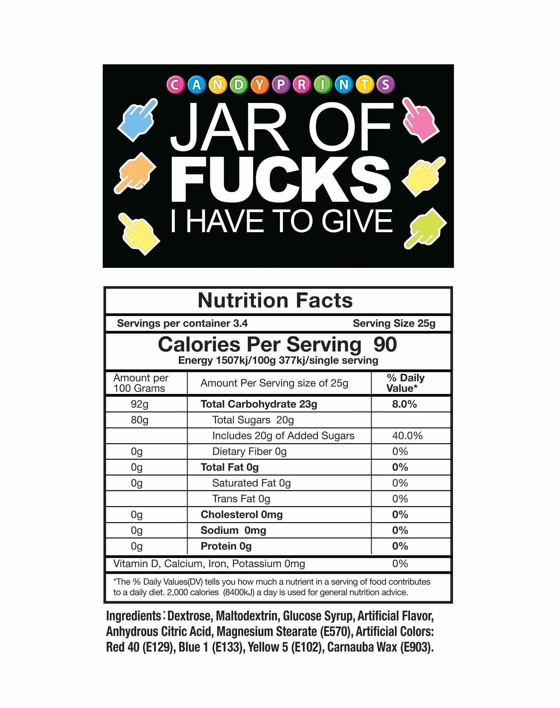 Introducing the Jar of Fucks I Have to Give —a hilariously bold gift for the unapologetic friend who embraces life’s absurdities. Each jar is packed with 2 pounds of delicious, fruit-flavored candies, cheekily shaped like a middle finger. Whether you're dealing with a difficult coworker or playfully teasing a close friend, this jar offers a sweet yet sassy way to express yourself. Its easy-grip design ensures you can always keep it in reach for those moments when words just aren’t enough.
