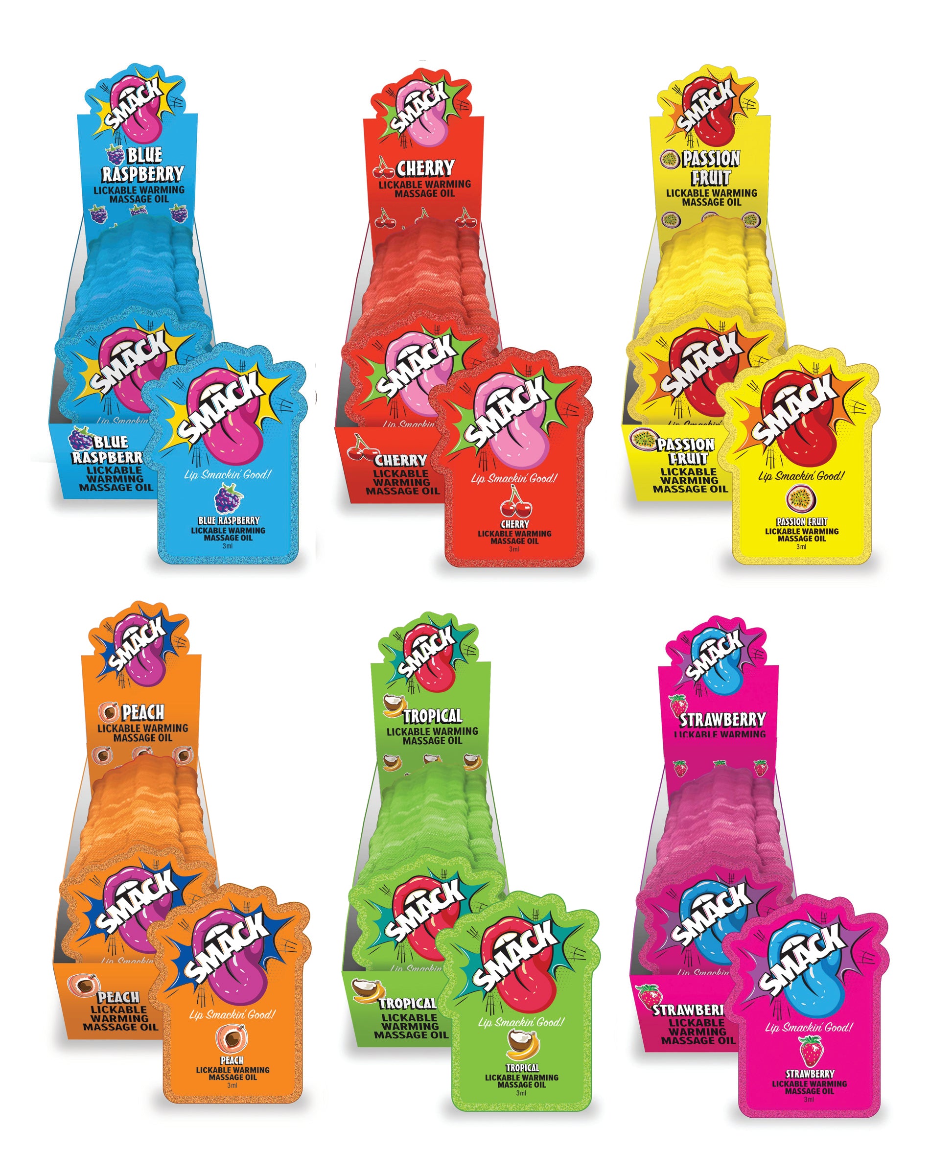 SMACK Massage Oils are designed to enhance intimacy with their warming sensation and delectable flavors. Choose from six enticing options: Blue Raspberry, Cherry, Passion Fruit, Peach, Strawberry, and Tropical. Whether at home or on-the-go, these oils provide an unforgettable experience.